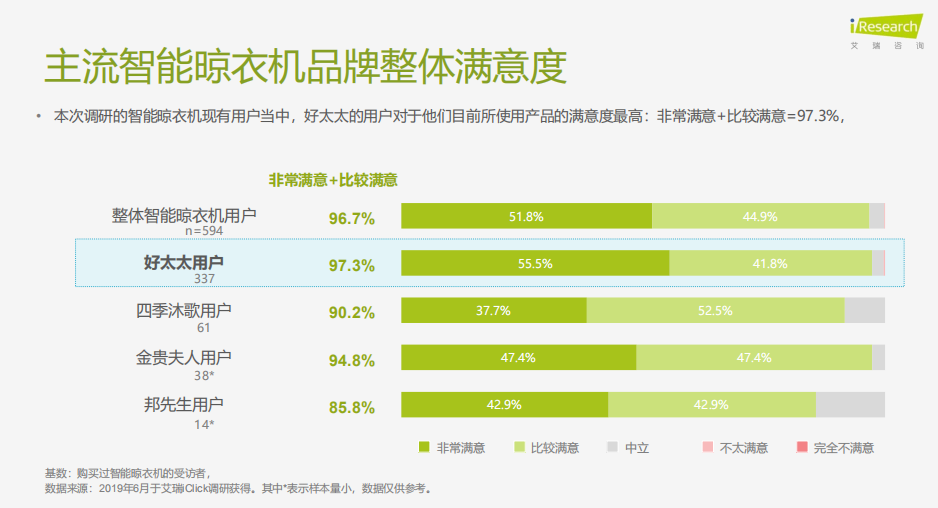 經(jīng)過(guò)深入調(diào)研后,艾瑞在曬衣節(jié)當(dāng)天發(fā)布《國(guó)貨當(dāng)智強(qiáng)——家居晾曬智能化趨勢(shì)洞察報(bào)告》,報(bào)告顯示,消費(fèi)者普遍認(rèn)同的國(guó)貨家居代表品牌有好太太、水星家紡、歐派、富安娜與九牧等。此外,好太太在主流晾衣機(jī)品牌的整體滿意度是最高的,并且在智能功能、材質(zhì)做工或者安裝售后等任何一個(gè)維度上看,好太太都是當(dāng)仁不讓的行業(yè)第一名。