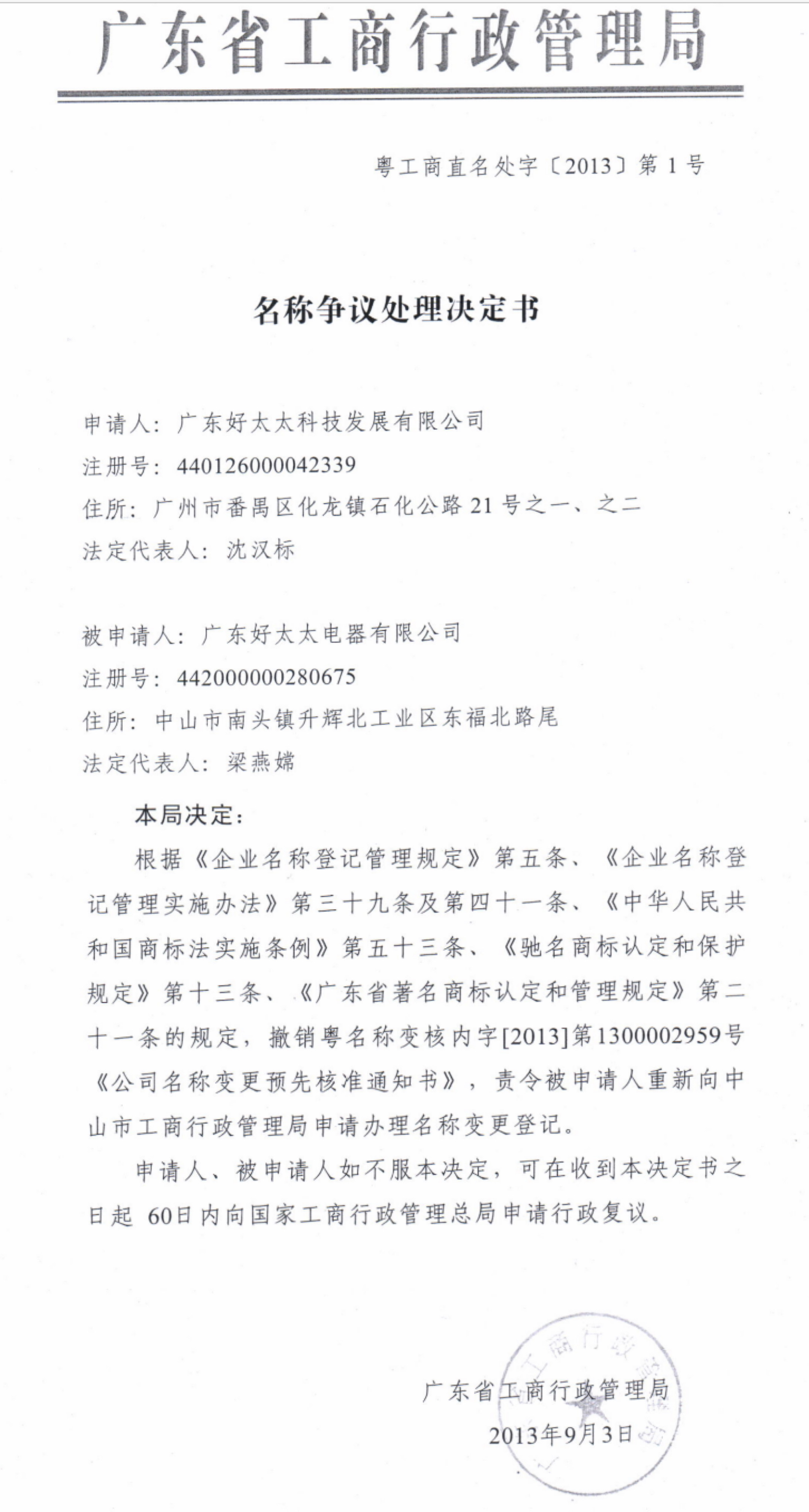 2009年11月20日,時稱中山市好太太電器有限公司的法定代表人老健明設立了中山市好生活電器有限公司,后于2013年1月30日更名為“中山市好太太電器有限公司”、于2013年2月27日更名為“廣東好太太電器有限公司”。因該企業(yè)名稱中再次使用“好太太”字號涉嫌不正當競爭,被廣東好太太集團向廣東省工商行政管理局投訴,于2013年9月3日被廣東省工商局責令變更企業(yè)名稱。
