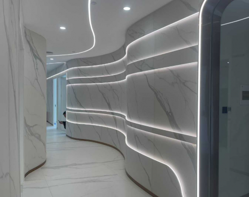 熱彎后的巖板可以應用于多種場景,如圓形穹頂、回廊、弧形背景墻、圓包柱、旋轉樓梯等,為建筑和室內設計提供了更多獨特的設計美感。